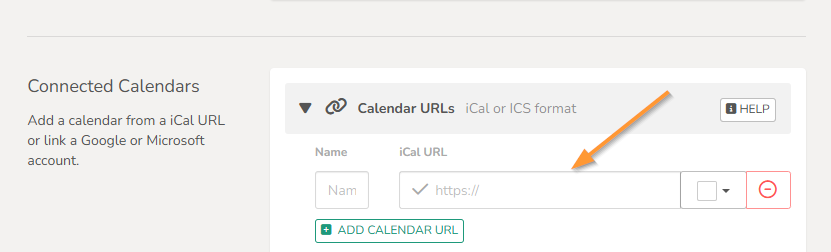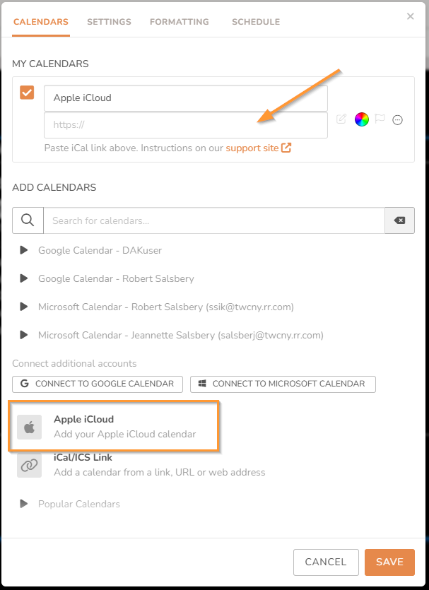 Make sure to save your changes before you leave the Calendar Tab. On the Custom Screen Editor, click on your Calendar Block, then open the Block Editor. Here, you will need to click the Apple iCloud calendar to add it to your My Calendar List, then place the URL in the space provided. See below: