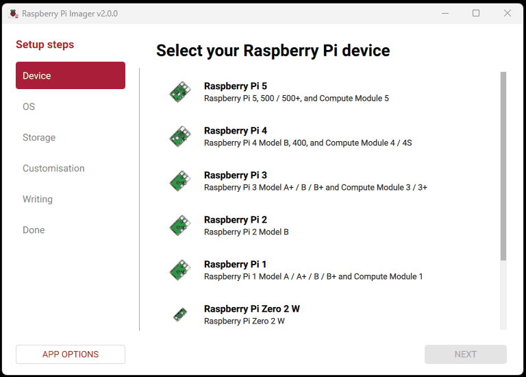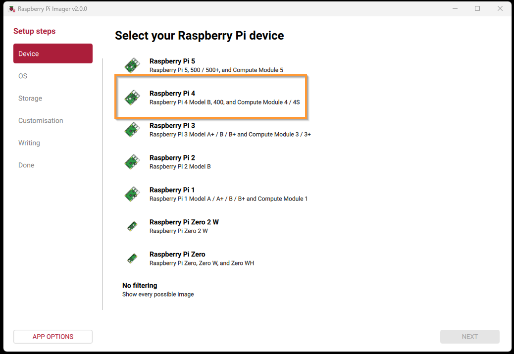 Once installed, start the Imager software and select the Raspberry Pi 4 Device as seen below: