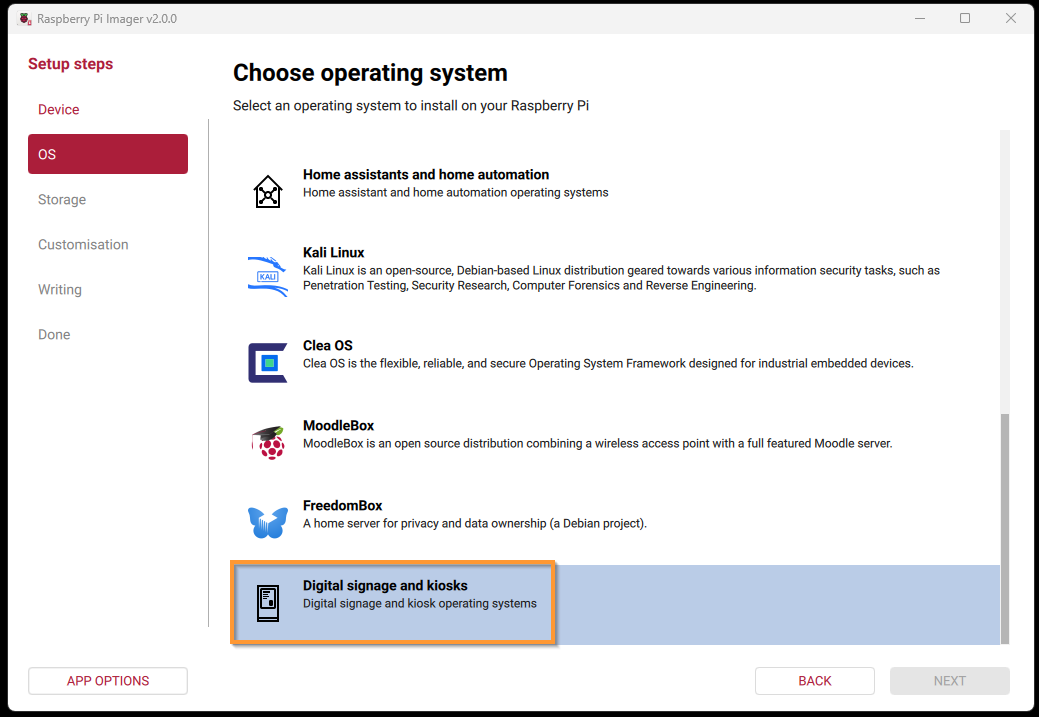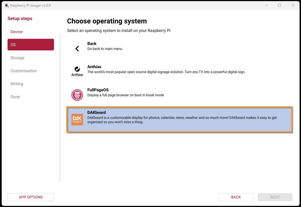 The DAKOS has been relocated in the Raspberry Pi Imager program. This has made the Video Walkthrough slightly outdated. It is still under the Other Specific-Purpose OS section, but it has been moved to the subsection called Digital Signage and Kiosks. Please see the section below called Get DAKOS with the Raspberry Pi Imager for more details: