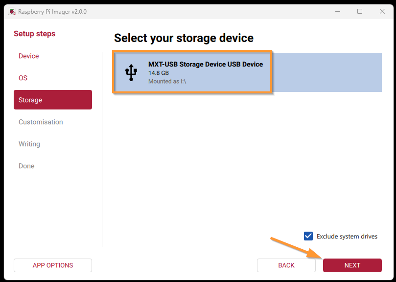 Finally, after you insert your SD card into your reader, you can click the Choose Storage button to select it from your list of Drives and click Next: