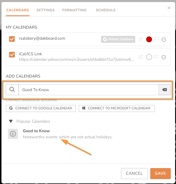 The calendar account must be linked to your DAKboard account before you can use it to find the Calendar. See the Links in the Helpful Articles section below to learn how to add your external accounts.