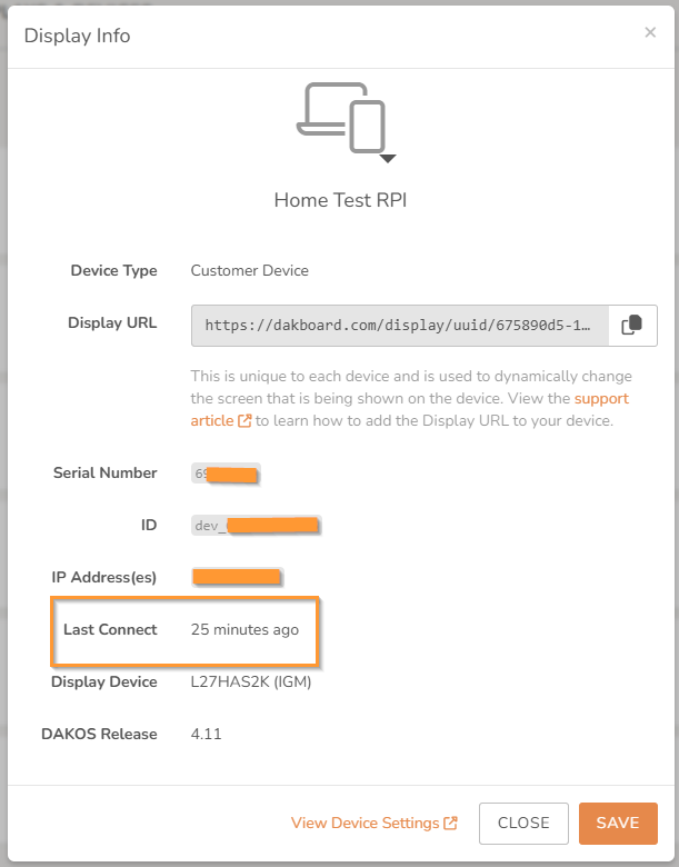 Any DAKOS device with a last connect less than 6 hours is considered online by our service. This is because we perform connection checks once every 6 hours. Your Display may be offline even if the Green Dot and the Last Connect are in this range. You can confirm if it is online if you are on the same network as the Display with the device you are using to view this page, by clicking the View Device Settings button at the bottom of the Settings tab. If this opens a new tab and connects to your Displays' Setting Page, you know it is online. From there, try changing your screen again and see if it updates. If you are offline, try restarting the Device.