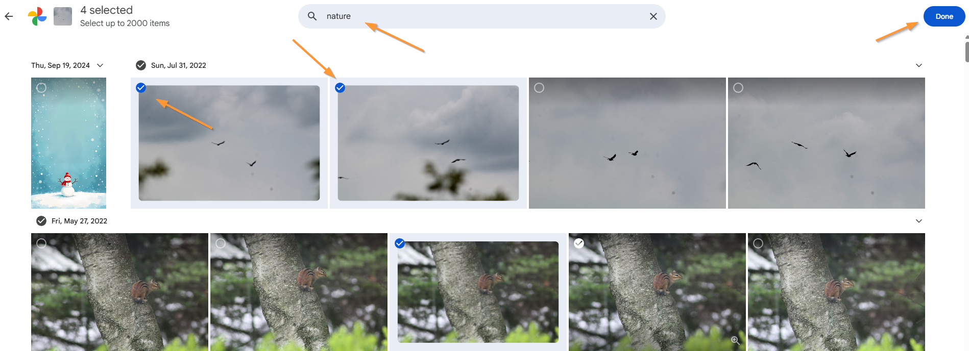 From the Photo Picker page, you can search for the photos you wish to add by their File or Album name or place a Check in the Circle found in the upper left corner of each photo you want to download. See below: