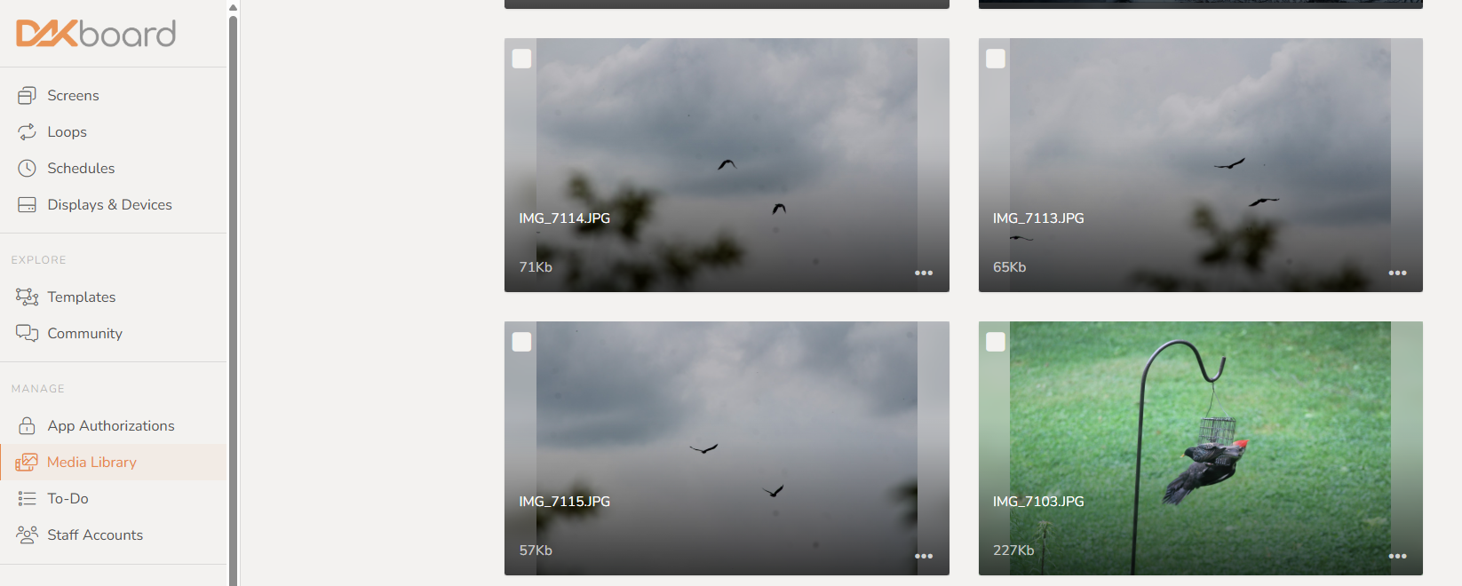 The Media Library has been around for a while with DAKboard Plus Subscriptions. It is now also available on the Essential Paid plan. The Media Library is only available with your Custom Screens and cannot be added to the Predefined Screen. To learn how to use this tool, see our article How to use the Media Library Photo Block.