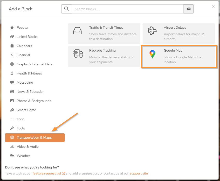 To add the Google Maps block, open your Custom Screen editor, click the Add A Block button, navigate to the Transportation & Maps section, or search for Google Maps, and add the block. See below: