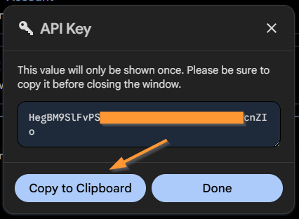 Make sure to copy your API key, as it will only be shown once. See below: