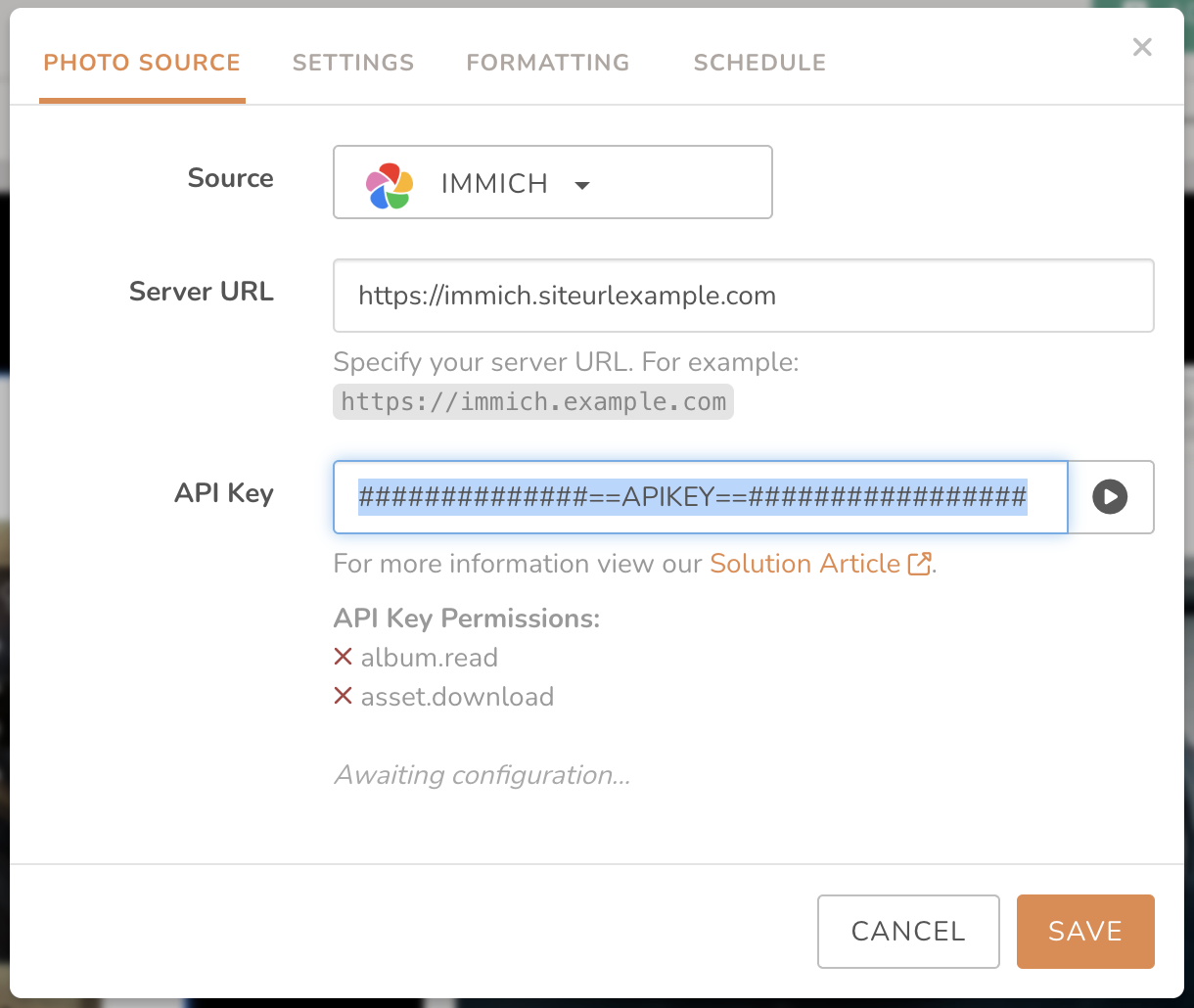 The rest of this article assumes you have already set up your Immich Server and added Photos to it. It will show you how to link your Immich Account to DAKboard and set it up on your screen.