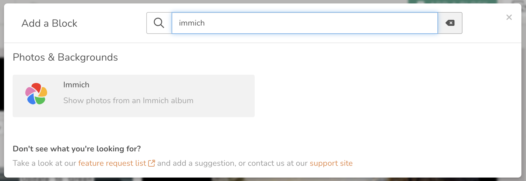 With you API key ready, return to your DAKboard account, open the Custom Screen Editor where you want to add your Photo Block, and add the block to the Screen. Make sure you select the Immich Photo source.